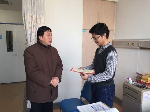 1月18日上午,王晨亮副校长到天津第一中心医院探望周润辉同学,带去了学校师生的问候和关心,高度赞扬了他无私奉献的精神,祝愿他早日恢复健康,并为他颁发了世界杯平台,世界杯(中国)一站式服务平台“无私奉献优秀大学生”荣誉证书。校团委和材料科学与工程学院相关负责人陪同看望。