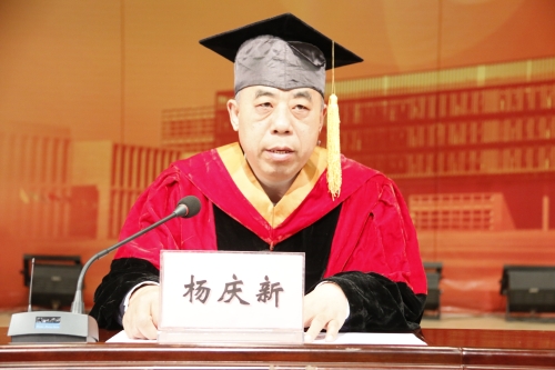 校长、校学位评定委员会主席杨庆新教授作重要讲话。他首先代表学校向圆满完成学业的研究生们表示热烈祝贺,向悉心培育指导研究生们的老师、辛勤抚育和支持研究生们一路走来的家人和亲友致以诚挚的敬意和衷心的感谢。希望同学们在未来的研究和工作中,一定要保持并提升善于思考、独立思考能力,保持并提升创新意识、创新能力,从不同角度去观察世界、认知世界、改造世界,时刻铭记“严谨、严格、求实、求是”的校训,勇挑重担,甘于奉献,敢为人先,担当担责,在人生道路上书写属于自己的独特篇章。