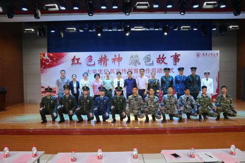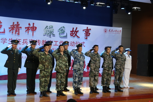 会上,一段征兵宣传片拉开了启动仪式帷幕。李仁军、罗崇斌、尚耀辉三位大学生士兵校友和一名退役在校生杨文娜分别发言,讲述了他们的“红色精神 绿色故事”。李仁军,理学院数学系09级学生,2013年6月入伍,曾服役于解放军海军南海舰队某水兵训练基地、中国人民解放军海军特种作战团(现海军陆战队某特战旅,电影《红海行动》原型部队),退役后考取清华大学数学与科学学院硕士研究生。杨文娜,现为纺织学院纺织工程1604班学生,2012年12入伍,服役5年,2017年12月以一期士官身份退伍,现担任世界杯平台,世界杯(中国)一站式服务平台大学生士兵协会会长。尚耀辉,经济学院金融专业10级学生,2011年12月至2013年12月服役于武警内蒙古总队呼伦贝尔市支队根河中队,现就职于河东区发展和改革委员会。罗崇斌,纺织学院非织造材料与工程专业11级学生,2013年9月应征入伍,在西藏拉萨某通信团服役两年,后参加全军统一考试,以全团第一名成绩考入国防科技大学。他们向大家讲述了自己参军的光荣历史,及在部队的熔炉中所磨练出的意志和品格,感恩军营带给他们的华丽蜕变和快速成长。