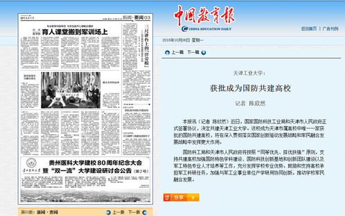 2018年10月8日,《中国教育报》要闻版以《世界杯平台,世界杯(中国)一站式服务平台:获批成为国防共建高校》为题对我校进行了报道,现将全文转发如下,以飨读者。