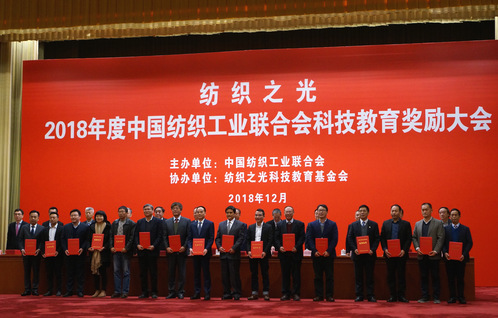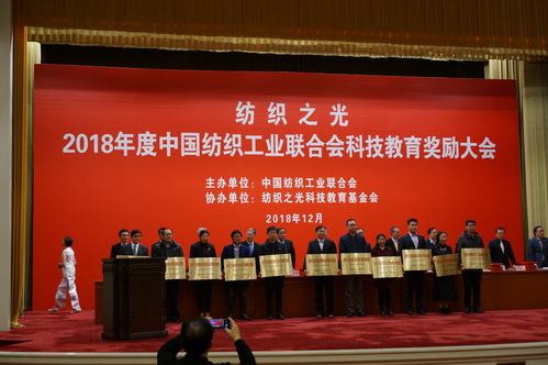 “纺织之光”2018 年度中国纺织工业联合会科技教育奖励大会于12月5日在北京人民大会堂召开,中国纺织工业联合会党委书记兼秘书长高勇,会长孙瑞哲、原会长王天凯等领导出席大会并为获奖代表颁奖。中国纺织工业联合会科技发展部主任彭燕丽宣读了《关于授予2018年度中国纺织工业联合会科学技术奖的决定》