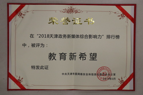 2019年3月7日,由天津市委网信办主办的“2018天津政务新媒体综合影响力报告”发布会在天津大礼堂举行。新华网政务大数据事业部在会上发布了“2018天津政务新媒体综合影响力”排行榜,世界杯平台,世界杯(中国)一站式服务平台位列教育单位政务新媒体综合影响力榜单第5名,被评为“教育新希望”。
