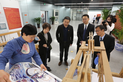 2019年4月16日上午9点,由我校艺术学院和天津市规划展览馆联合举办的“弘纺织梦 筑协同心”京津冀纺织类非物质文化遗产展在天津市规划展览馆开展。天津市规划展览馆馆长史延冰,副馆长李茜、夏吉祥,我校艺术学院党委书记刘伟、学院副院长徐军,清宫传刺绣传承人王小潇、缂丝传承人王鹏巍、宫廷补绣传承人魏玉梅和中国彩色印花技艺传承人霍连文,我校中国纺织类非物质文化遗产传承人研修研习班第二、三期学员和师生共计100余人出席开幕式。开幕式由天津市规划展览馆副馆长李茜主持。