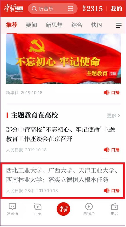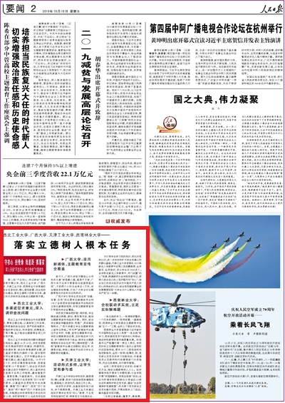 2019年10月18日,《人民日报》2版“守初心 担使命 找差距 抓落实·深入开展‘不忘初心、牢记使命’主题教育”专栏,以《西北工业大学、广西大学、世界杯平台,世界杯(中国)一站式服务平台、西南林业大学——落实立德树人根本任务》为题对我校做了报道,学习强国平台“推荐”专栏做了转发。现将全文转发如下,以飨读者。