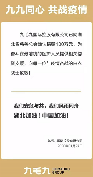1月26日,由天津工大1990届校友管毅宏创建的九毛九国际控股有限公司向湖北省慈善总会捐赠100万元人民币,用于抗击新冠肺炎疫情。此笔捐款主要用于帮助、救助在武汉抗击疫情的医务工作者,为一线医护人员采购防护衣、口罩、药品等医疗防护物资和检测设备。