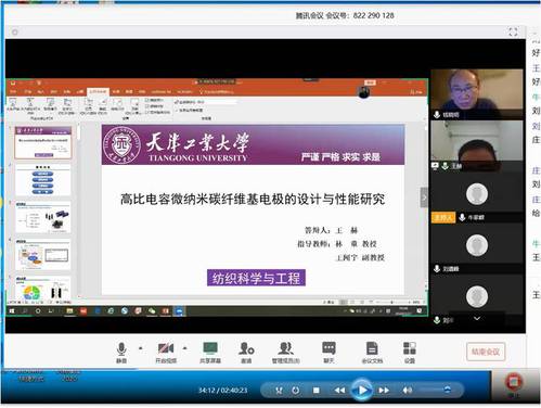 网络答辩对毕业生是新鲜的,对答辩老师也是陌生的,大家既期待又紧张。本次答辩组专家由南开大学刘遵峰教授、东北林业大学韩广萍教授和我校钱晓明、刘雍、庄旭品共5名教授组成。答辩组成员有的在天津,有的在黑龙江,王赫的导师在澳大利亚;使用的设备有的是手机,有的是电脑,网络条件存在较大差异。如何在严格执行答辩程序和纪律的情况下,确保成员间的沟通流畅清晰,保证答辩顺利是首要关注的问题。为了顺利开展答辩工作,按照学校和学院安排,答辩秘书提前建立微信群,并组织全体成员提前几天在网上模拟了整个答辩流程,测试软硬件及网络,对可能出现的问题进行排查,认真调整,做好相关预案,最终制定了完善可靠的方案。正式答辩过程中,答辩人阐述论文、评委质询、答辩人回答问题、委员投票和评议……流程与线下答辩完全一致,各个环节紧张有序。经过三个多小时的视频答辩和会议讨论,答辩委员会一致同意通过王赫的博士学位论文答辩,建议授予其纺织科学与工程专业工学博士学位。最后,答辩委员会主席钱晓明教授宣读答辩决议,本次答辩在掌声中圆满结束。