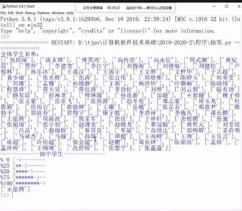 3.利用课程讲授的知识自主设计了一套抽签程序,实时在线抽签回答问题,提升同学们学习的积极性,也让大家看到了学以致用的实例;同时利用网络授课的形式,及时演示程序调试过程,还可以让有困惑的同学进行程序分享,同步解析答疑;