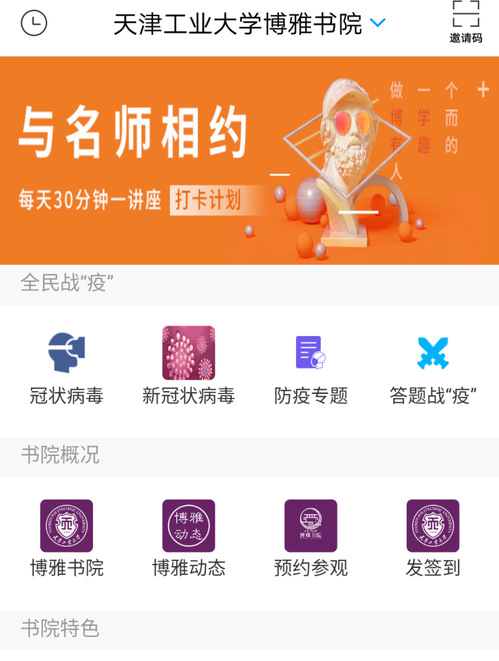 书院学习平台发布了“名师相约 传承文化”名师打卡 30场讲座,内容包括“中国古典四大名著”、聊斋志异、牡丹亭、儒林外史、“三言二拍”、周易、诗经、离骚、庄子等。在名师导读下,同学们更深入地了解中国传统文学和文化。