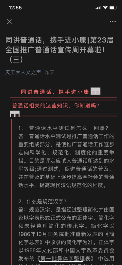 活动期间,学校在校园、各学院大楼等明显位置张贴推普宣传海报、条幅,利用LED滚动屏等宣传本届推普周主题;党委宣传部、研究生院、教师发展中心、团委、学工部以及各学院充分利用微信、网站推送全国推普活动海报、视频,并将天津市教育委员会网站、天津语言文字网、“普通话天津”微信二维码转发至教师和学生QQ群。