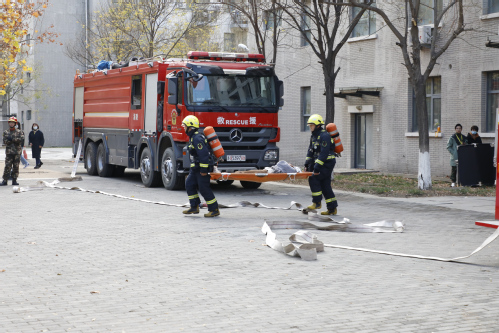 在起火和报警环节,烟雾施放组施放烟雾模拟火场,公寓管理员发现火情后立即拨打校内微型消防站电话和119报警电话,学校立即启动应急预案。在学校消防应急分队进行灭火和搜救的演练环节,学校应急分队接警后立即赶往火灾现场;指挥组进行现场指挥;警戒组对火场周边进行警戒,疏通道路;疏散组和公寓管理员组织学生有序疏散、快速撤离;搜救组进入演练区域搜救被困人员。最后,在精武消防中队灭火救援环节,消防战士驾乘城市主战消防车,用高压水枪对火场发起总攻,迅速扑灭火患,营救出因“窒息”被困学生。