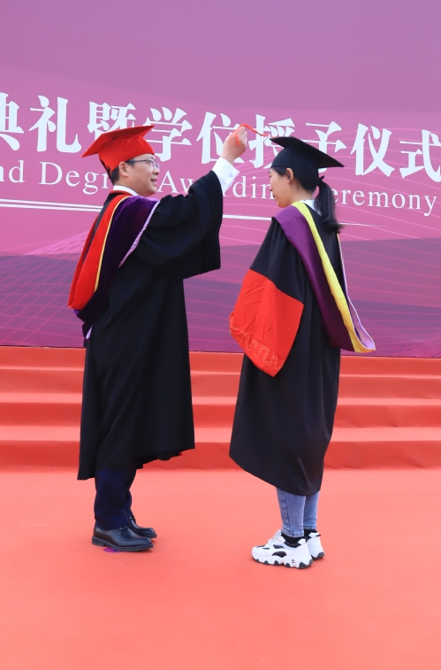 伴随着《拉德斯基进行曲》,学位授予仪式正式开始。身着学位服的毕业生们坚定地走上主席台,向老师们鞠躬致谢,校领导和校学位评定委员会成员为每位毕业生逐一扶正流苏、握手祝贺并合影留念。