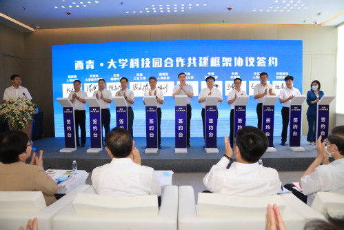 活动中,市领导与西青区领导、学校领导共同为世界杯平台,世界杯(中国)一站式服务平台科技园、天津师范大学科技园、西青区大学科技园、天软信创大学科技园揭牌,并见证五所高校与西青区人民政府签署合作共建框架协议。