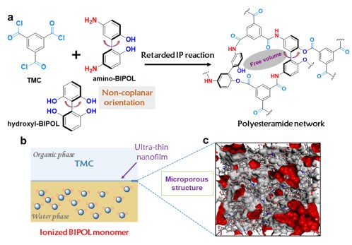 耐溶剂膜材料是有机溶剂纳滤技术的核心。针对现有有机溶剂纳滤膜普遍存在的溶剂渗透性差,分离精度低等挑战,研究团队从膜材料分子设计入手,首次合成了具有2,2'-联苯酚(BIPOL)刚性结构的两种小分子,采用易工业化的界面聚合制膜技术,制备了超薄无缺陷、且具有高微孔性的联苯酚耐溶剂纳滤膜(~5 nm),用于有机溶剂体系的筛分。所研制的联苯酚耐溶剂纳滤膜具有超高的甲醇渗透系数(13~17.5 LMH/bar),且较低的截留分子量(~233 Da),显著优于目前文献报道的有机溶剂纳滤膜的筛分水平。令人兴奋的是,该聚联苯酚纳滤膜可以实现分子量、尺寸相近的甲基橙(MO, 327 Da)和亚甲基蓝(MB, 320 Da)的精准筛分,其分离机理为尺寸排阻与道南效应的共同作用。研究团队所研制的聚联苯酚纳滤膜具有规模化放大生产的潜力,在特种分离如药物分子精准分离方面有巨大的应用前景。