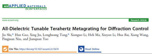近日,我校电子与信息工程学院副教授石嘉在TOP期刊《ACS Applied Materials & Interfaces》(影响因子10.383)发表了题为《All-Dielectric Tunable Terahertz Metagrating for Diffraction Control》的研究成果,并被选为Supplementary Cover。石嘉副教授为该论文的第一作者和共同通讯作者,该成果由世界杯平台,世界杯(中国)一站式服务平台、中国工程物理研究院流体物理研究所、天津大学共同完成。论文链接:https://pubs.acs.org/doi/10.1021/acsami.2c13674