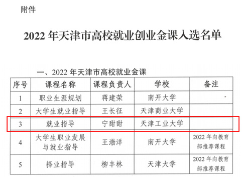 近日,市委教育工委、市教委公布了2022年天津市高校就业创业金课入选名单,我校《就业指导》课程入选。此次评选各高校申报课程总计40门,最终评选出7门2022年天津市高校就业创业金课,其中就业金课3门。